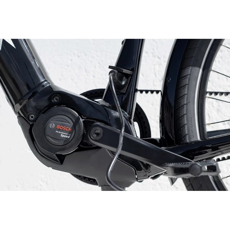 Un cadre aluminium ouvert haute performance hydroformé, au design élancé, qui renferme une batterie Bosch PowerTube 625 Wh totalement intégrée, un moteur Bosch Performance Speed (250 W, 75 Nm) ultra-puissant qui vous permet de maintenir des vitesses allant jusqu’à 45 km/h et un contrôleur Kiox. Ajoutez à cela une transmission par courroie Gates CDX dotée d’un moyeu arrière Enviolo CVT, une fourche télescopique SR Suntour avec dispositif de verrouillage, de puissants freins à disques hydrauliques Magura à 4 pistons pour une puissance d’arrêt par tous les temps, un système de feux avant et arrière intégré, des garde-boues, un porte-bagages arrière et des roues de 27,5 pouces rigides à axe traversant. Compatible avec Range Boost.